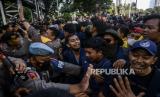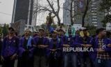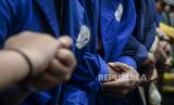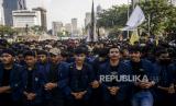 Sejumlah mahasiswa berpegangan saat unjuk rasa di kawasan Patung Kuda, Jakarta, Kamis (15/9/2022). Unjuk rasa tersebut menuntut Pemerintah mencabut keputusan terkait kenaikan BBM, menunda proyek strategis nasional yang tidak berdampak langsung kepada masyarakat dan mengalihkan anggarannya ke subsidi BBM yang lebih berdampak pada masyarakat serta menerapkan regulasi pemakaian BBM bersubsidi secara tegas. (FOTO : Republika/Putra M. Akbar)