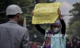 Mahasiswa membawa poster wajah Ketua DPR RI Puan Maharani saat aksi di depan Gedung DPRD Provinsi Jawa Barat, Jalan Diponegoro, Kota Bandung, Kamis (15/9/2022). Dalam aksi tersebut mereka menolak keputusan pemerintah menaikkan harga bahan bakar minyak (BBM) di tengah beban rakyat yang semakin berat akibat pandemi Covid-19 dan naiknya harga kebutuhan pokok. Republika/Abdan Syakura (FOTO : REPUBLIKA/ABDAN SYAKURA)