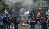 Mahasiswa dari berbagai perguruan tinggi melakukan aksi di depan Gedung DPRD Provinsi Jawa Barat, Jalan Diponegoro, Kota Bandung, Kamis (15/9/2022). Dalam aksi tersebut mereka menolak keputusan pemerintah menaikkan harga bahan bakar minyak (BBM) di tengah beban rakyat yang semakin berat akibat pandemi Covid-19 dan naiknya harga kebutuhan pokok. Republika/Abdan Syakura (FOTO : REPUBLIKA/ABDAN SYAKURA)