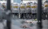 Petugas kepolisian berjaga di halaman Gedung DPRD Provinsi Jawa Barat, Jalan Diponegoro, Kota Bandung, Kamis (15/9/2022). Dalam aksi tersebut mereka menolak keputusan pemerintah menaikkan harga bahan bakar minyak (BBM) di tengah beban rakyat yang semakin berat akibat pandemi Covid-19 dan naiknya harga kebutuhan pokok. Republika/Abdan Syakura (FOTO : REPUBLIKA/ABDAN SYAKURA)