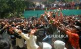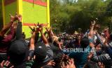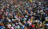 Ribuan warga berebut apem saat Tradisi Sebar Apem Ya Qowiyyu di Jatinom, Klaten, Jawa Tengah, Jumat (16/9/2022). Sebanyak 4 ton apem itu berasal dari sedekah masyarakat dan gunungan apem yang disediakan oleh pihak kecamatan dan panitia acara dari Pengelola Pelestari Peninggalan Kiyai Ageng Gribig (P3KAG) disebar untuk masyarakat. Tradisi ini dimulai sejak Tahun 1589 oleh Ki Ageng Gribig yang membagikan oleh-oleh apem usai menunaikan ibadah haji. (FOTO : Republika/Wihdan Hidayat)