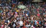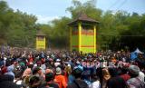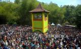 Ribuan warga menunggu apem saat Tradisi Sebar Apem Ya Qowiyyu di Jatinom, Klaten, Jawa Tengah, Jumat (16/9/2022). Sebanyak 4 ton apem itu berasal dari sedekah masyarakat dan gunungan apem yang disediakan oleh pihak kecamatan dan panitia acara dari Pengelola Pelestari Peninggalan Kiyai Ageng Gribig (P3KAG) disebar untuk masyarakat. Tradisi ini dimulai sejak Tahun 1589 oleh Ki Ageng Gribig yang membagikan oleh-oleh apem usai menunaikan ibadah haji. (FOTO : Republika/Wihdan Hidayat)