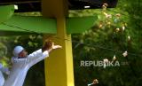 Panitia menyebarkan apem dari menara saat Tradisi Sebar Apem Ya Qowiyyu di Jatinom, Klaten, Jawa Tengah, Jumat (16/9/2022). Sebanyak 4 ton apem itu berasal dari sedekah masyarakat dan gunungan apem yang disediakan oleh pihak kecamatan dan panitia acara dari Pengelola Pelestari Peninggalan Kiyai Ageng Gribig (P3KAG) disebar untuk masyarakat. Tradisi ini dimulai sejak Tahun 1589 oleh Ki Ageng Gribig yang membagikan oleh-oleh apem usai menunaikan ibadah haji. (FOTO : Republika/Wihdan Hidayat)