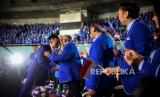 Kader Partai Demokrat saat mendengarkan Ketua Umum Partai Demokrat Agus Harimurti Yudhoyono (AHY) menyampaikan pidato kebangsaan pada Rapat Pimpinan Nasional (Rapimnas) Partai Demokrat di Jakarta Convention Center (JCC), Jakarta, Jumat (16/9/2022). Pidato kebangsaan tersebut membahas tentang isu-isu nasional serta strategi Partai Demokrat dalam menghadapi Pemilu 2024 mendatang. Republika/Thoudy Badai (FOTO : Republika/Thoudy Badai)