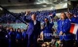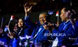 Ketua Umum Partai Demokrat Agus Harimurti Yudhoyono (AHY) (kiri) bersama istri Annisa Pohan (kedua kiri) disaksikan Presiden keenam RI Susilo Bambang Yudhoyono (kanan)  menyapa kader Partai Demokrat usai menyampaikan pidato kebangsaan pada Rapat Pimpinan Nasional (Rapimnas) Partai Demokrat di Jakarta Convention Center (JCC), Jakarta, Jumat (16/9/2022). Pidato kebangsaan tersebut membahas tentang isu-isu nasional serta strategi Partai Demokrat dalam menghadapi Pemilu 2024 mendatang. Republika/Thoudy Badai (FOTO : Republika/Thoudy Badai)
