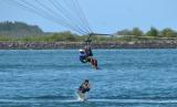 Penerbang pesawat tempur TNI AU mendarat di laut usai terbang dengan parasut parasailing saat mengikuti latihan Emergency Escape and Eject di perairan Tanjung Benoa, Badung, Bali, Jumat (16/9/2022). Kegiatan yang diikuti puluhan penerbang pesawat tempur tersebut diselenggarakan oleh Koopsud II guna meningkatkan kemampuan penerbang tempur khususnya saat keluar dari pesawat menggunakan kursi lontar saat menyelamatkan diri dalam kondisi darurat. (FOTO : ANTARA/Fikri Yusuf)