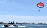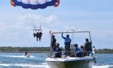 Penerbang pesawat tempur TNI AU terbang dengan parasut parasailing mengikuti latihan Emergency Escape and Eject di perairan Tanjung Benoa, Badung, Bali, Jumat (16/9/2022). Kegiatan yang diikuti puluhan penerbang pesawat tempur tersebut diselenggarakan oleh Koopsud II guna meningkatkan kemampuan penerbang tempur khususnya saat keluar dari pesawat menggunakan kursi lontar saat menyelamatkan diri dalam kondisi darurat. (FOTO : ANTARA/Fikri Yusuf)