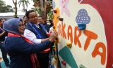 Gubernur DKI Jakarta Anies Baswedan (kanan) dan istrinya Fery Farhati (kiri) mewarnai tulisan Jakarta saat peresmian Taman Literasi Martha Christina Tiahahu di Blok M, Jakarta Selatan, Ahad(18/9/2022). Taman yang dibangun oleh Badan Usaha Milik Daerah (BUMD) DKI Jakarta PT Mass Rapid Transit (MRT) Jakarta tersebut dibangun untuk menjadi ruang baca sekaligus ruang berkreativitas dan bertukar ide bagi seluruh lapisan masyarakat. (FOTO : ANTARA/Aditya Pradana Putra)