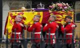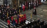 Peti mati Ratu Elizabeth II dibawa ke Westminster Abbey untuk pemakamannya di pusat kota London, Senin, 19 September 2022. Ratu, yang meninggal dalam usia 96 pada 8 September, akan dimakamkan di Windsor bersama mendiang suaminya, Pangeran Philip , yang meninggal tahun lalu. (FOTO : AP/Bernat Armangue)