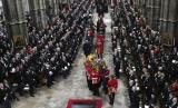 REPUBLIKA.CO.ID, LONDON -- Upacara pemakaman kenegaraan Ratu Elizabeth II digelar di Westminster Abbey, di pusat kota London, Senin 19 September 2022. Ratu, yang meninggal dalam usia 96 pada 8 September lalu dimakamkan di Windsor bersama mendiang suaminya, Pangeran Philip, yang meninggal tahun lalu.
