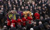 Peti mati Ratu Elizabeth II dibawa ke Westminster Abbey untuk pemakamannya di pusat kota London, Senin, 19 September 2022. Ratu, yang meninggal dalam usia 96 pada 8 September, akan dimakamkan di Windsor bersama mendiang suaminya, Pangeran Philip , yang meninggal tahun lalu. (FOTO : AP/Frank Augstein)