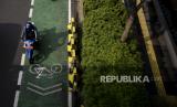 Pengendara motor melintasi jalur sepeda di kawasan Sudirman, Jakarta, Rabu (21/9/2022). Pemerintah Provinsi DKI Jakarta akan membangun jalur sepeda sepanjang 196,45 kilometer pada 26 ruas jalan di wilayah DKI Jakarta yang terdiri dari 40,06 kilometer jalur sepeda terproteksi, 154,73 kilometer jalur sepeda berbagi dan 1,67 jalur sepeda di trotoar. (FOTO : Republika/Putra M. Akbar)