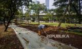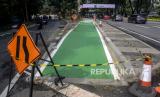 Pekerja menyelesakan pembangunan jalur sepeda di kawasan Semanggi, Jakarta, Rabu (21/9/2022). Pemerintah Provinsi DKI Jakarta akan membangun jalur sepeda sepanjang 196,45 kilometer pada 26 ruas jalan di wilayah DKI Jakarta yang terdiri dari 40,06 kilometer jalur sepeda terproteksi, 154,73 kilometer jalur sepeda berbagi dan 1,67 jalur sepeda di trotoar. (FOTO : Republika/Putra M. Akbar)