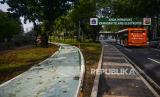 Bus Transjakarta melintas di dekat pembangunan jalur sepeda di kawasan Semanggi, Jakarta, Rabu (21/9/2022). Pemerintah Provinsi DKI Jakarta akan membangun jalur sepeda sepanjang 196,45 kilometer pada 26 ruas jalan di wilayah DKI Jakarta yang terdiri dari 40,06 kilometer jalur sepeda terproteksi, 154,73 kilometer jalur sepeda berbagi dan 1,67 jalur sepeda di trotoar. (FOTO : Republika/Putra M. Akbar)