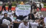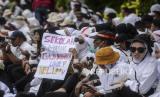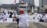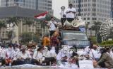 Sejumlah massa aksi yang tergabung dalam Dewan Pengurus Nasional Forum Komunikasi Nakes dan Non-Nakes Indonesia saat unjuk rasa di kawasan Patung Kuda, Jakarta, Kamis (22/9/2022). Unjuk rasa tersebut menuntut Presiden Joko Widodo segera menerbitkan Peraturan Presidan (PP) khusus yang mengatur honorer nakes dan non nakes diangkat menjadi aparatur sipil negara. (FOTO : Republika/Putra M. Akbar)