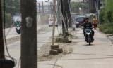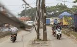 REPUBLIKA.CO.ID, TANGERANG -- Pengendara motor melintas di dekat tiang listrik yang berdiri di tengah jalan di Jalan Raya Prancis, Kosambi, Kabupaten Tangerang, Banten, Kamis (22/9/2022). Pemerintah Kabupaten Tangerang berencana memindahkan tiang listrik dan kabel utilitas yang berada di tengah jalan tersebut karena membahayakan pengendara dan menyebabkan kemacetan.