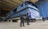 Petugas Bea Cukai berjaga di dekat barang bukti saat konferensi pers terkait tindak pidana pencucian uang (TPPU) hasil kejahatan penyelundupan rokok impor di Batam, Kepulauan Riau, Jumat (23/9/2022). Kantor Wilayah Direktorat Jenderal Bea dan Cukai Khusus Kepulauan Riau bekerjasama dengan aparat penegak hukum mengungkap kasus TPPU dari kejahatan penyelundupan rokok impor dengan menyita uang tunai serta sejumlah aset tersangka berupa satu unit Kapal layar motor (KLM) GT210, satu unit mobil, satu unit kapal giant High Speed Craft (HSC), lima unit kapal Speed Craft (HSC), dan tiga unit speed boat dengan nominal mencapai Rp44,6 miliar. (FOTO : ANTARA/Teguh Prihatna)