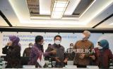 Direktur Utama BSI Hery Gunardi (tengah), Direktur Compliance & Human Capital Tribuana Tunggadewi, Wakil Direktur Utama Bob Tyasika Ananta, Komisaris Utama BSI Adiwarman Azwarkarim, Direktur Risk Management Tiwul Widyastuti (dari kiri) saat pelaksanaan Rapat Umum Pemegang Saham Luar Biasa BSI di Jakarta, Jumat (23/9/2022). RUPSLB BSI tersebut membahas Persetujuan Rencana Penambahan Modal dengan Memberikan Hak Memesan Efek Terlebih Dahulu I (PMHMETD I) Perseroan, Perubahan Anggaran Dasar Perseroan dan Perubahan serta Susunan Pengurus Perseroan. Foto:Tahta Aidilla/Republika. (FOTO : Tahta Aidilla/Republika)