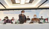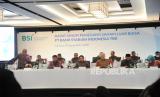 Direktur Utama BSI Hery Gunardi (ketiga kiri) didampingi jajaran Direksi dan Komisaris saat melaksanaan Rapat Umum Pemegang Saham Luar Biasa BSI di Jakarta, Jumat (23/9/2022). RUPSLB BSI tersebut membahas Persetujuan Rencana Penambahan Modal dengan Memberikan Hak Memesan Efek Terlebih Dahulu I (PMHMETD I) Perseroan, Perubahan Anggaran Dasar Perseroan dan Perubahan serta Susunan Pengurus Perseroan. Tahta Aidilla/Republika. (FOTO : Tahta Aidilla/Republika)
