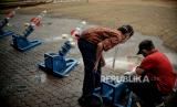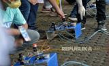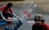 Petugas membantu pelajar menyiapkan roket air saat mengikuti Kompetisi Roket Air Regional di Pusat Peragaan IPTEK, Jakarta, Ahad (25/9/2022). Indonesia Science Center atau PP IPTEK dan BRIN menggelar kompetisi roket air yang diikuti pelajar sebanyak 360 pelajar dari mulai SD, SMP dan SMA diseluruh Jabodetabek dan Banten dengan tujuan guna mewadahi potensi bidang sains bagi generasi muda untuk terus berkembang dan turut berperan dalam kemajuan teknologi di bidang antariksa. Republika/Thoudy Badai (FOTO : Republika/Thoudy Badai)