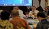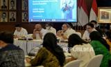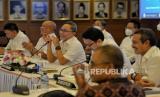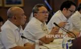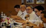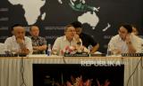REPUBLIKA.CO.ID,JAKARTA -- Menteri Perdagangan Zulkifli Hasan bersama Wakil Menteri Perdagangan Jerry Sambuaga (kanan) dan Sekjen Mendag Suhanto (kiri) saat menyampaikan keterangan terkait 100 Hari Kerja Menteri Perdagangan di Gedung Kementerian Perdagangan, Gambir, Jakarta Pusat, Ahad (25/9/2022).