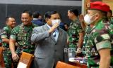 Menteri Pertahanan Prabowo Subianto (tengah) bersama Panglima TNI Jenderal TNI Andika Perkasa (kiri) dan Kepala Staf Angkatan Darat (KSAD) Jenderal TNI Dudung Abdurachman (kanan) bersiap mengikuti rapat kerja dengan Komisi I DPR di Kompleks Parlemen, Senayan, Jakarta, Senin (26/9/2022). Rapat kerja tersebut beragendakan pembahasan penyesuaian Rencana Kerja dan Anggaran (RKA) Kementerian Pertahanan/TNI TA 2023. Republika/Prayogi (FOTO : Republika/Prayogi)