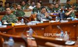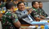 REPUBLIKA.CO.ID, JAKARTA -- Menhan Prabowo Subianto, Panglima TNI Jenderal Andika Perkasa, KSAD Dudung Abdurachman dan KSAL Yudo Margono mengikuti Rapat Dengar Pendapat (RDP) dengan Komisi I DPR di Kompleks Parlemen, Senayan, Jakarta, Senin (26/9/2022). Rapat Dengar Pendapat tersebut membahas mengenai penyesuaian RKA Kemhan/TNI TA 2023.