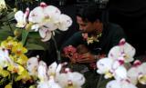 Pekerja menata tanaman anggrek yang dipajang di salah satu gerai dalam Batu International Orchid Show 2nd di Balaikota Amongtani, Batu, Jawa Timur, Senin (26/9/2022). Pameran yang berlangsung selama sembilan hari tersebut menampilkan berbagai jenis anggrek dari berbagai negara antara lain Thailand, Vietnam, Indonesia dan Malaysia. (FOTO : ANTARA/Ari Bowo Sucipto)