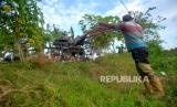 Pekerja usai membajak sawah di Bantul, Yogyakarta, Senin (26/9/2022). Pascakenaikan harga BBM, jasa bajak sawah mulai dinaikkan oleh pemilik traktor. Saat ini untuk lahan 1 meter x 10 meter jasa bajak Rp 1.800 hingga Rp 2.000 dari sebelumnya Rp 1.500. Kenaikan tarif jasa bajak sawah ini dilakukan pemilik traktor untuk menutup selisih kenaikan harga solar. (FOTO : Republika/Wihdan Hidayat)