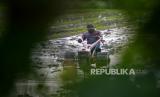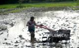 Pekerja membajak sawah di Bantul, Yogyakarta, Senin (26/9/2022). Pascakenaikan harga BBM, jasa bajak sawah mulai dinaikkan oleh pemilik traktor. Saat ini untuk lahan 1 meter x 10 meter jasa bajak Rp 1.800 hingga Rp 2.000 dari sebelumnya Rp 1.500. Kenaikan tarif jasa bajak sawah ini dilakukan pemilik traktor untuk menutup selisih kenaikan harga solar. (FOTO : Republika/Wihdan Hidayat)