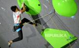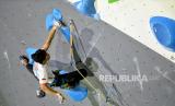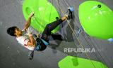 Atlet panjat tebing Indonesia Raviandi Ramadhan berusaha memanjat untuk mencapai puncak pada laga final IFSC Seri Jakarta, di kawasan SCBD, Jakarya, Senin (26/9/2022). Raviandi gagal meraih medali dalam ajang IFSC Climbing World Cup 2022 setelah berhasil finish diurutan ke 8 dengan menorehkan skor 22+, Sementara itu podium tertinggi menjadi milik atlet asal Jepang Ao Yurikusa dengan capaian 29, disusul Masahiro Higuchi dan atlet asal Jerman Sebastian Halenke yang mengamankan peringkat dua dan tiga setelah meraih skor masing-masing 28. Republika/Thoudy Badai (FOTO : Republika/Thoudy Badai)