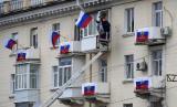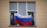 Pekerja menggantung bendera Rusia di sebuah gedung apartemen di Luhansk, Republik Rakyat Luhansk yang dikendalikan oleh separatis yang didukung Rusia, Ukraina timur, Selasa, 27 September 2022. Pemungutan suara dimulai Jumat di empat wilayah Ukraina yang dikuasai Moskow mengenai referendum untuk menjadi bagian dari Rusia . (FOTO : AP)