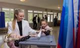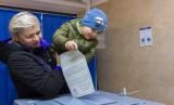 Seorang wanita menggendong anaknya saat memberikan suaranya di sebuah tempat pemungutan suara di Luhansk, Republik Rakyat Luhansk yang dikendalikan oleh separatis yang didukung Rusia, Ukraina, Selasa, 27 September 2022. Pemungutan suara dimulai Jumat di empat wilayah Ukraina yang dikuasai Moskow mengenai referendum menjadi bagian dari Rusia. (FOTO : AP)