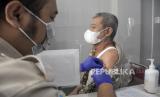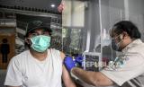 Petugas kesehatan menyuntikkan vaksin meningitis kepada warga di Kantor Kesehatan Pelabuhan (KKP) Kelas II Bandung, Jalan Cikapayang, Kota Bandung, Kamis (29/9/2022). Kantor Kesehatan Pelabuhan (KKP) Kelas II Bandung menyediakan sebanyak 100 hingga 400 dosis vaksin meningitis per hari yang diprioritaskan bagi jemaah umrah yang berangkat pada 10-31 Oktober 2022. (FOTO : REPUBLIKA/ABDAN SYAKURA)