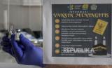 Petugas kesehatan menunjukkan vaksin meningitis di Kantor Kesehatan Pelabuhan (KKP) Kelas II Bandung, Jalan Cikapayang, Kota Bandung, Kamis (29/9/2022). Kantor Kesehatan Pelabuhan (KKP) Kelas II Bandung menyediakan sebanyak 100 hingga 400 dosis vaksin meningitis per hari yang diprioritaskan bagi jemaah umrah yang berangkat pada 10-31 Oktober 2022. (FOTO : REPUBLIKA/ABDAN SYAKURA)