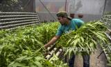 Pekerja memanen sayuran hidroponik saat gelaran Pesta DKPP Agri Market di Kantor Dinas Ketahanan Pangan dan Pertanian (DKPP) Kota Bandung, Jalan Arjuna, Cicendo, Kota Bandung, Kamis (29/9/2022). Kegiatan yang digelar dalam rangka Hari Jadi ke-212 Kota Bandung tersebut menyediakan bazar buah dan sayuran lokal, tanaman hias, pasar murah serta produk kuliner olahan. (FOTO : REPUBLIKA/ABDAN SYAKURA)