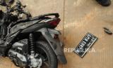 Sisa bagian belakang motor yang tidak terbakar usai kecelakaan di Jl KH Noer Ali, Kalimalang, Bekasi, Jawa Barat, Kamis (29/9/2020). Akibat kecelakaan tunggal motor mengalami musibah terbakar yang diduga terjadi karena konsleting arus listrik. Kejadian ini tidak ada koran jiwa, namun berimbas kemacetan lalu lintas. Foto: Tahta Aidilla/Republika. (FOTO : Tahta Aidilla/Republika)