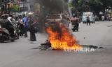 Warga berusaha memadamkan motor yang terbakar di Jl KH Noer Ali, Kalimalang, Bekasi, Jawa Barat, Kamis (29/9/2020). Akibat kecelakaan tunggal motor mengalami musibah terbakar yang diduga terjadi karena konsleting arus listrik. Kejadian ini tidak ada koran jiwa, namun berimbas kemacetan lalu lintas. (FOTO : Tahta Aidilla/Republika)