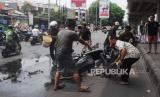 Warga berusaha memindahkan motor usai terbakar di Jl KH Noer Ali, Kalimalang, Bekasi (29/9/2020). Akibat kecelakaan tunggal motor mengalami musibah terbakar yang diduga terjadi karena konsletin arus listrik. Kejadian ini tidak ada koran jiwa, namun berimbas kemacetan lalu lintas. Foto: Tahta Aidilla/Republika. (FOTO : Tahta Aidilla/Republika)