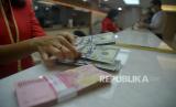 Karyawan menghitung uang rupiah dan dolar AS di salah satu gerai penukaran mata uang asing di Jakarta, Kamis (29/9/2022). Nilai tukar rupiah terhadap dolar Amerika Serikat (AS) ditutup menguat pada penutupan perdagangan Kamis (29/9/2022) sebesar 4 poin atau 0,03 persen ke level Rp15.262,50 per dolar AS. Prayogi/Republika. (FOTO : Prayogi/Republika.)