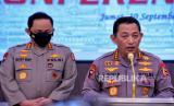 Kapolri Jendral Listyo Sigit Prabowo (kanan) saat memberikan keterangan dalam konferensi pers di Mabes Polri, Jakarta, Jumat (30/9/2022). Dalam keterangan tersebut, Kapolri Jendral Listyo Sigit Prabowo menegaskan mantan Kadiv Propam Polri Ferdy Sambo sudah tidak lagi menjadi anggota Polri serta resmi melakukan penahanan terhadap istrinya, Putri Candrawathi di Rutan Mabes Polri. Republika/Thoudy Badai (FOTO : Republika/Thoudy Badai)