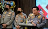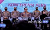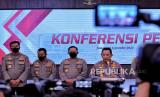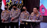 Kapolri Jendral Listyo Sigit Prabowo (kiri) didampingi jajaran petinggi polri lainnya saat memberikan keterangan dalam konferensi pers di Mabes Polri, Jakarta, Jumat (30/9/2022). Dalam keterangan tersebut, Kapolri Jendral Listyo Sigit Prabowo menegaskan mantan Kadiv Propam Polri Ferdy Sambo sudah tidak lagi menjadi anggota Polri serta resmi melakukan penahanan terhadap istrinya, Putri Candrawathi di Rutan Mabes Polri. Republika/Thoudy Badai (FOTO : Republika/Thoudy Badai)