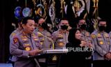 Kapolri Jendral Listyo Sigit Prabowo (kanan) didampingi jajaran petinggi polri lainnya saat memberikan keterangan dalam konferensi pers di Mabes Polri, Jakarta, Jumat (30/9/2022). Dalam keterangan tersebut, Kapolri Jendral Listyo Sigit Prabowo menegaskan mantan Kadiv Propam Polri Ferdy Sambo sudah tidak lagi menjadi anggota Polri serta resmi melakukan penahanan terhadap istrinya, Putri Candrawathi di Rutan Mabes Polri. Republika/Thoudy Badai (FOTO : Republika/Thoudy Badai)