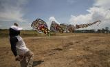 Peserta mencoba menerbangkan layangannya pada Festival Layang-layang Internasional 2022 di Long Beach Area Selatan, Pakuwon City, Surabaya, Jawa Timur, Sabtu (1/10/2022). Festival yang diikuti 92 peserta dari berbagai daerah di Indonesia serta dari mancanegara yakni Swedia, Polandia, Jepang, dan Singapura tersebut memperlombakan kategori layang-layang dua dimensi, layang-layang tiga dimensi, dan layang-layang rangkaian/train bukan naga. (FOTO : ANTARA/Moch Asim)
