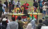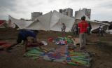 Peserta menyelamatkan layangannya di dekat tenda yang roboh karena diterpa angin kencang saat Festival Layang-layang Internasional 2022 di Long Beach Area Selatan, Pakuwon City, Surabaya, Jawa Timur, Sabtu (1/10/2022). Festival yang berlangsung hingga 2 Oktober dan diikuti 92 peserta dari berbagai daerah di Indonesia serta dari mancanegara yakni Swedia, Polandia, Jepang, dan Singapura tersebut sementara dihentikan oleh panitia karena faktor cuaca. (FOTO : ANTARA/Moch Asim)