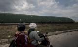 Pengendara sepeda motor melintas di dekat rangkaian gerbong Kereta Cepat Jakarta-Bandung di Tegalluar, Bandung, Jawa Barat, Sabtu (1/10/2022). PT Kereta Cepat Indonesia China (KCIC) akan melaksanakan uji dinamis Kereta Cepat Jakarta-Bandung pada November 2022.  (FOTO : ANTARA/Aprillio Akbar)