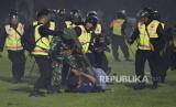 Pasukan Anti Huru-hara menangkap suporter usai pertandingan sepak bola BRI Liga 1 di Stadion Kanjuruhan, Malang, Sabtu (1/10/2022). (FOTO : AP)