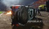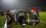 Sebuah mobil polisi terbalik akibat kericuhan usai pertandingan BRI Liga 1 antara Arema melawan Persebaya di Stadion Kanjuruhan, Malang, Jatim, Minggu (2/10/2022). Sebanyak 127 orang dilaporkan meninggal dunia dalam kerusuhan tersebut. (FOTO : ANTARA FOTO/H Prabowo)