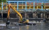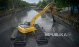 Petugas Suku Dinas Sumber Daya Air (SDA) Jakarta Pusat mengoperasikan alat berat untuk mengeruk endapan lumpur saat masih berlangsungnya program Gerebek Lumpur di Kali Cideng, Jakarta, Ahad (2/10/2022). Program gerebek lumpur merupakan salah satu upaya Pemprov DKI dalam mengantisipasi banjir di Jakarta dengan cara memperluas, memperdalam serta memperbesar volume sungai-sungai dan aliaran air agar daya tampung menjadi lebih besar. Adapun panjang wilayah Kali Cideng yang dikeruk tersebut sekitar 490 meter dengan target 7.000 meter kubik lumpur. (FOTO : Republika/Prayogi)