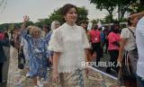 Wakil Direktur Utama Bank Mandiri Alexandra Askandar mengikuti fashion show batik on the street saat pelaksanaan Hari Bebas Kendaraan Bermotor (HBKB) di Jalan Jenderal Sudirman, Jakarta, Ahad (2/10/2022). Kegiatan yang turut didukung oleh Kementerian Perindustrian tersebut digelar sebagai rangkaian Hari Batik Nasional dan HUT Bank Mandiri ke-24. (FOTO : Republika/Prayogi)